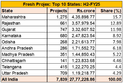 Gujarat ranked fourth, recording Rs 3,27,399 crore, a moderate fall of 1.5 percent on a H-o-H basis. Renewable and Power-transmission projects continued to anchor investment—Adani Green’s Rs 10,710 crore hybrid project (Khavda), Reliance Industries’ Rs 10,000 crore solar at Lakadia, NTPC Renewable Energy’s Rs 9,975 crore Kutch solar park, and the Rs 28,033 crore Green Energy Corridor-III by Gujarat Energy Transmission Corporation collectively gave the state a strong clean-energy profile.